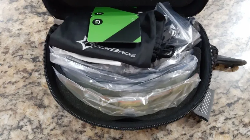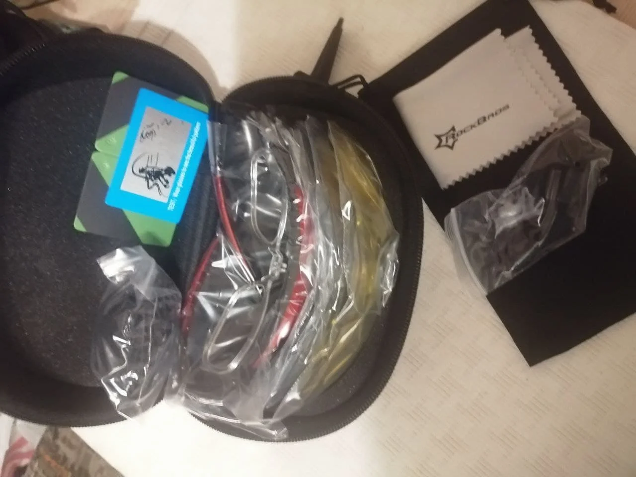 Отличные очки. Пришли за полтора месяца. Всё целое. Покупаю такие уже с 14го года, не жалею. Пробовала других производителей, подобной модели, не то. Вернулась к rockbros. Только вот теряются, тонут или ломаются, но это ,как и все другие очки ) Использую на велосипеде, и водных походах, в основном с жёлтыми и прозрачными стёклами. Комплектация шикарная. Жаль по отдельности всё дороже, чем комплект. Голубыми и чёрными линзами не пользовалась ни разу. Очки рекомендую. Запаха химии нет