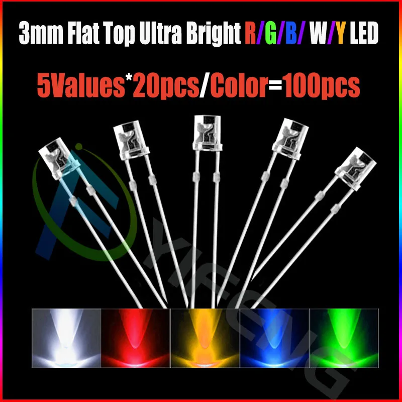 20 шт. x 5 цветов = 100 шт., 3 мм, 2 контакта, плоский верх светодиодный белый, красный, желтый, синий, зеленый, широкоугольный светодиод