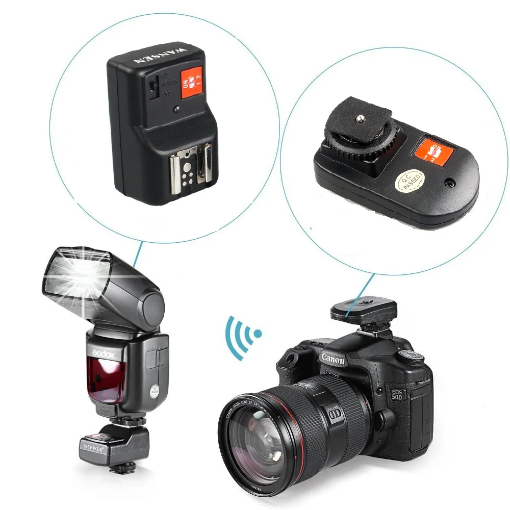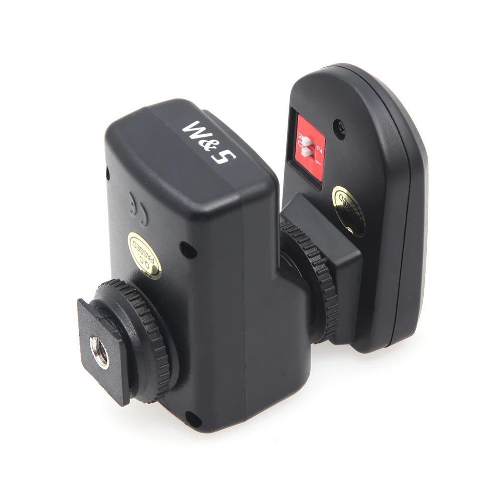 1. Вставьте гнездо для горячего башмака передатчика в гнездо для горячего башмака камеры, Подключите вспышку к ресиверу, включите приемник. Убедитесь, что переключатель каналов как передатчика, так и приемника на одном канале. Нажмите кнопку тестирования на передатчике, чтобы проверить перед съемкой.