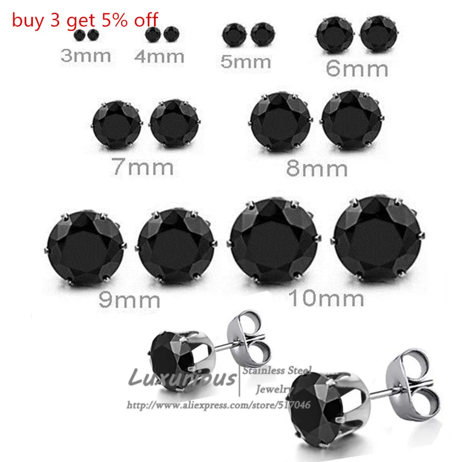 Роскошные серьги-гвоздики из нержавеющей стали 10 парлот, круглые серьги с черным фианитом, размеры 3-10 мм
