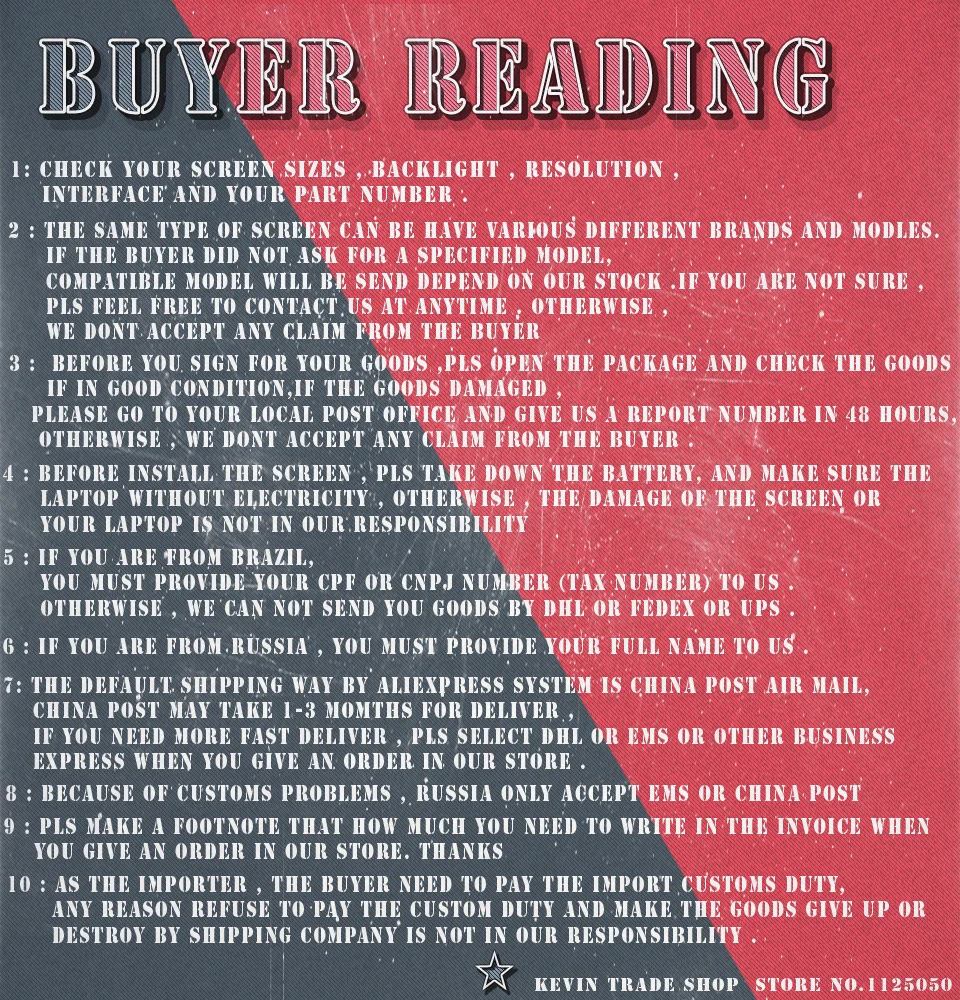 Перед заказом, пожалуйста, проверьте и подтвердите whehterРазмер экрана, разрешение, Тип подсветки, тип интерфейса и расположениеМожет быть применен к вашему ноутбуку, если вы понятия не имеете, пожалуйста, спросите нас.