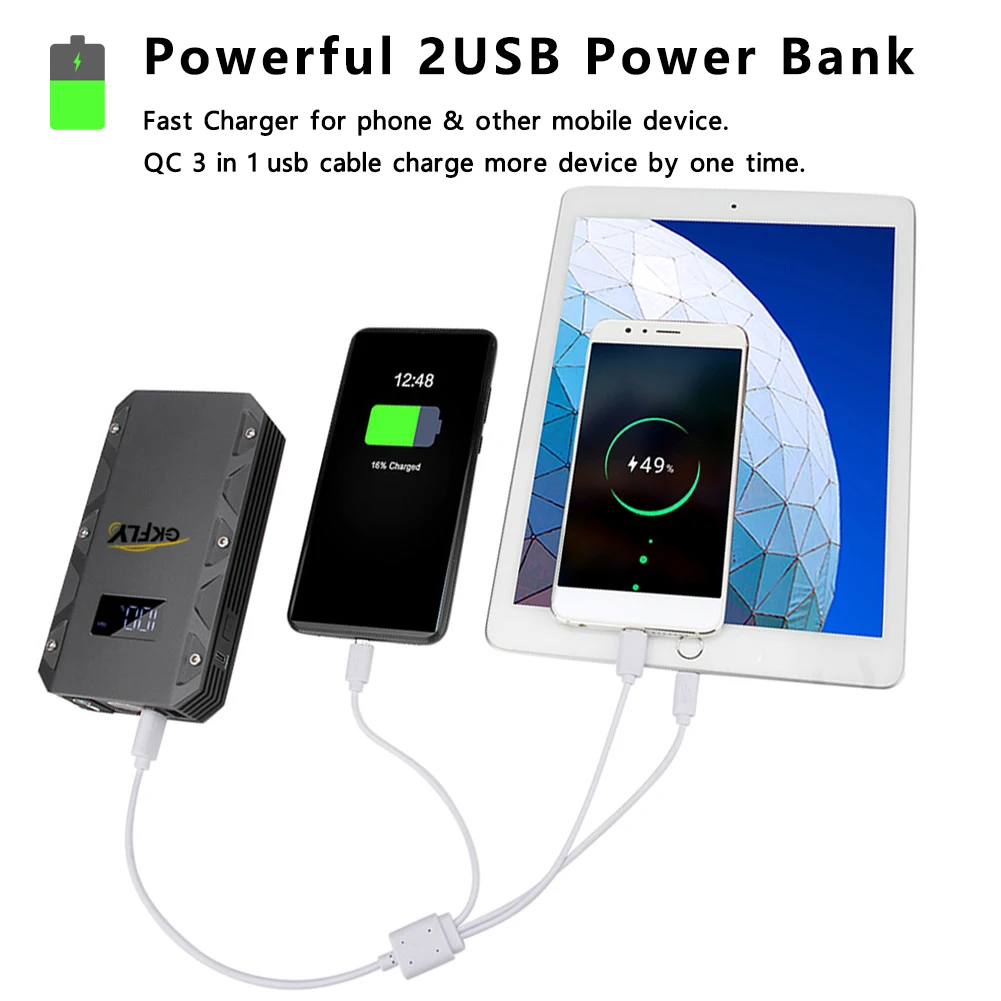 Товар шел из Китая больше 2-х месяцев. Всё соответствует описанию. Зарядки от сети в комплекте нет, только шнурок. Заводить автомобиль не пробовали, т.к. пока шла посылка, сильные морозы закончились. Будем пробовать. Телефон заряжает, упаковка отличная.