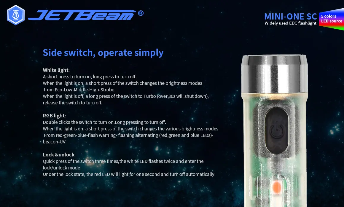 Превосходный хороший продукт, у меня нет опыта работы с JetBeam, однако качество сборки очень хорошее. Корпус состоит из двух частей, обработанных алюминием с пластиковыми линзами. По сравнению с Nitecore TIKI, пользовательский интерфейс лучше, на мой взгляд, требуется только одно короткое нажатие кнопки, чтобы включить основной свет, а затем нажмите, чтобы переключить его. Свет будет сиять на ранее определенном уровне яркости. Длительное нажатие и удержание дадут мгновенную полную яркость так же, как и TIKI. Вспомогательный светодиод RGB очень яркий, слишком яркий, на мой взгляд, в постоянном режиме, в режиме маяка мигает достаточно ярко для цели. Ультрафиолетовый светодиод является очень хорошей дополнительной функцией. Если мне нужно сохранить один, я хотел бы выбрать Jetbeam вместо Nitcore TIKI.