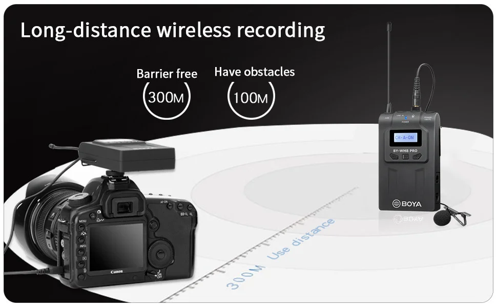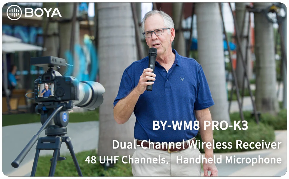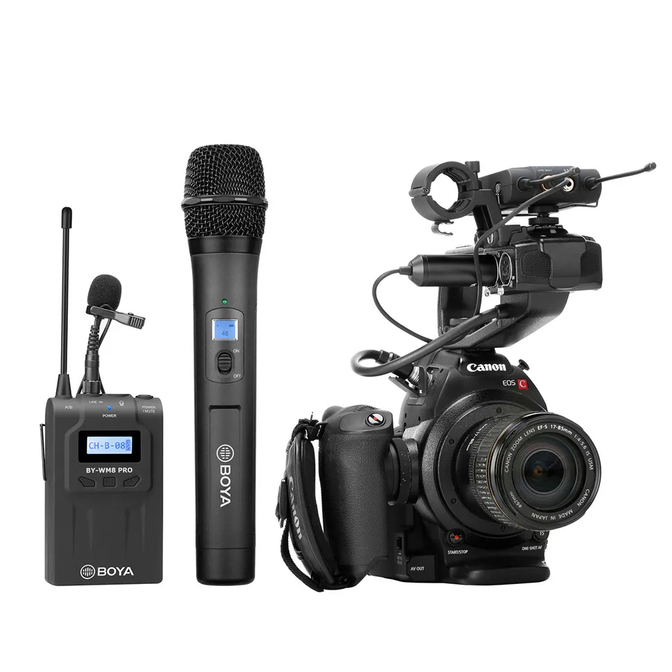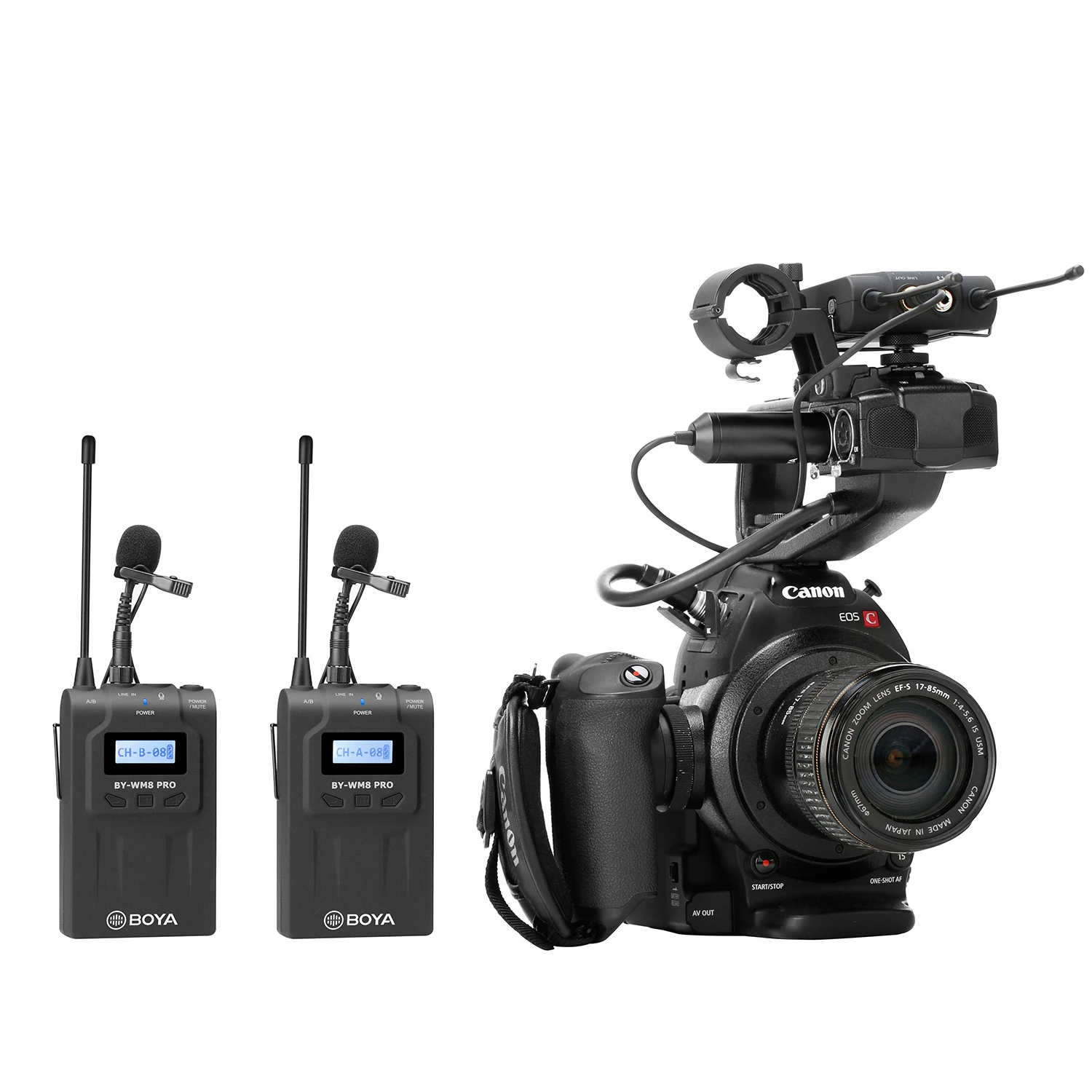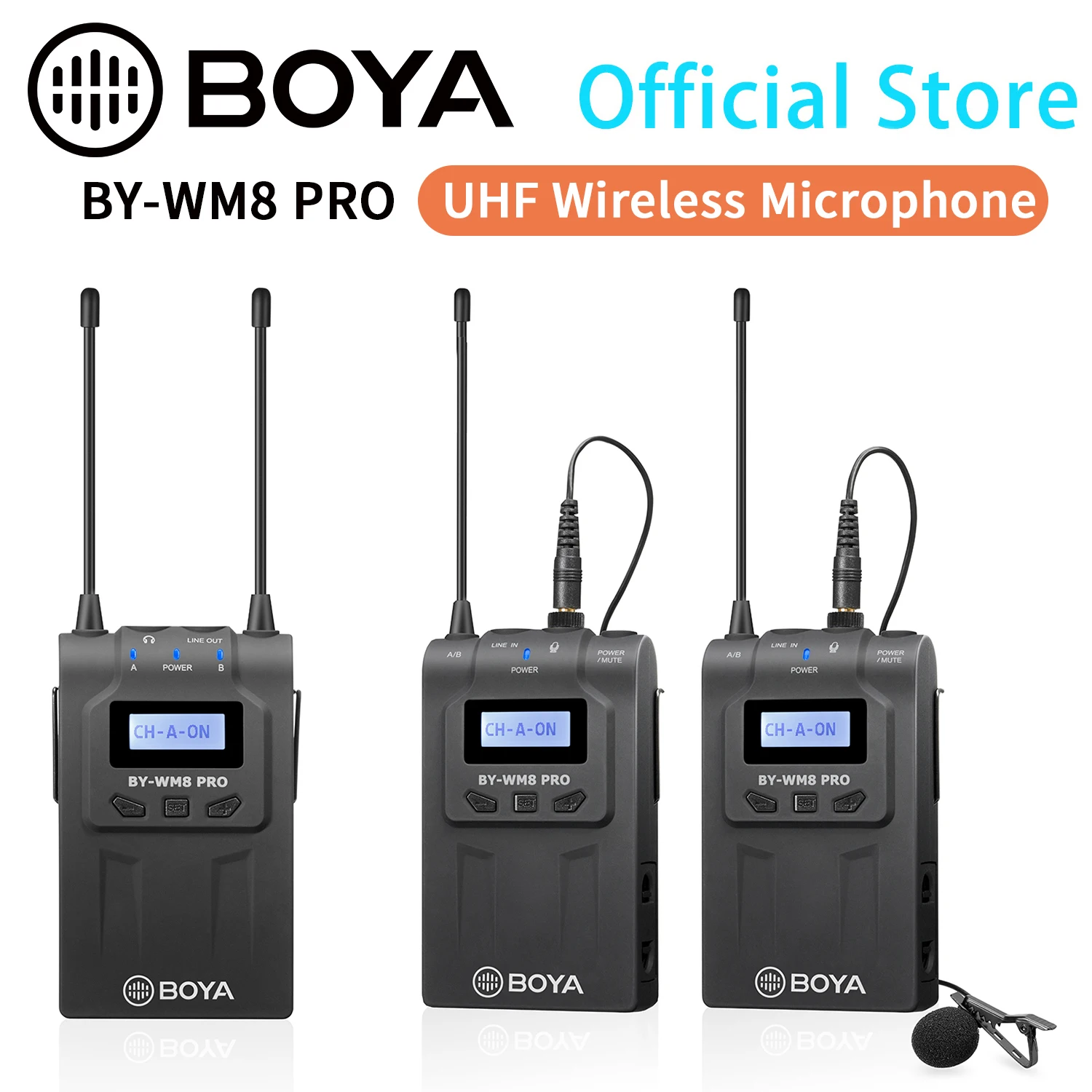 BOYA BY-WM8 Pro-K2-Обновленная двухканальная Беспроводная микрофонная система UHFДля захвата аудио с двумя предметами, оснащен простым в считывании ЖК-дисплеем, широким переключением полосы пропускания RF, PLL-synthesized тюнингом и цифровой схемой. Посылка подходит для широкого спектра беспроводных приложений, таких как интервью,Сбор электронных новостей (ENG), электронные полевые производства (EFP), производство фильмов,Бизнес и образовательные приложения, и многое другое. Система BY-WM8 Pro-K2 состоит из двух передатчиков, камера-приемник с креплением,И два всенаправленных lavalier микрофона. Также в комплект входит адаптер для крепления обуви, один выходной кабель 1/8 "-XLR, один выходной кабель 1/8-1/8", Чехол для переноски. Приемник изготовлен с разъемами на выходе для микрофона и наушников.Передатчик бодипака включает в себя разъем микрофона и линию в разъеме.Примечание: чтобы сохранить срок службы батареи, если используется только один передатчик, выключите другой канал от приемника. -Цифровая компания-До 48 выбираемых каналов-Двухканальный-До 32 МГц пропускной способности-Простая и Гибкая беспроводная синхронизация между передатчиком и приемником с помощью инфракрасного излучения.-Удобное меню-Функция слива-Широкий спектр аксессуаров адаптирует систему к большинству требований-Блокировка-вилка позволяет избежать случайного изменения настроек-Дальность передачи: до 100 метров/300