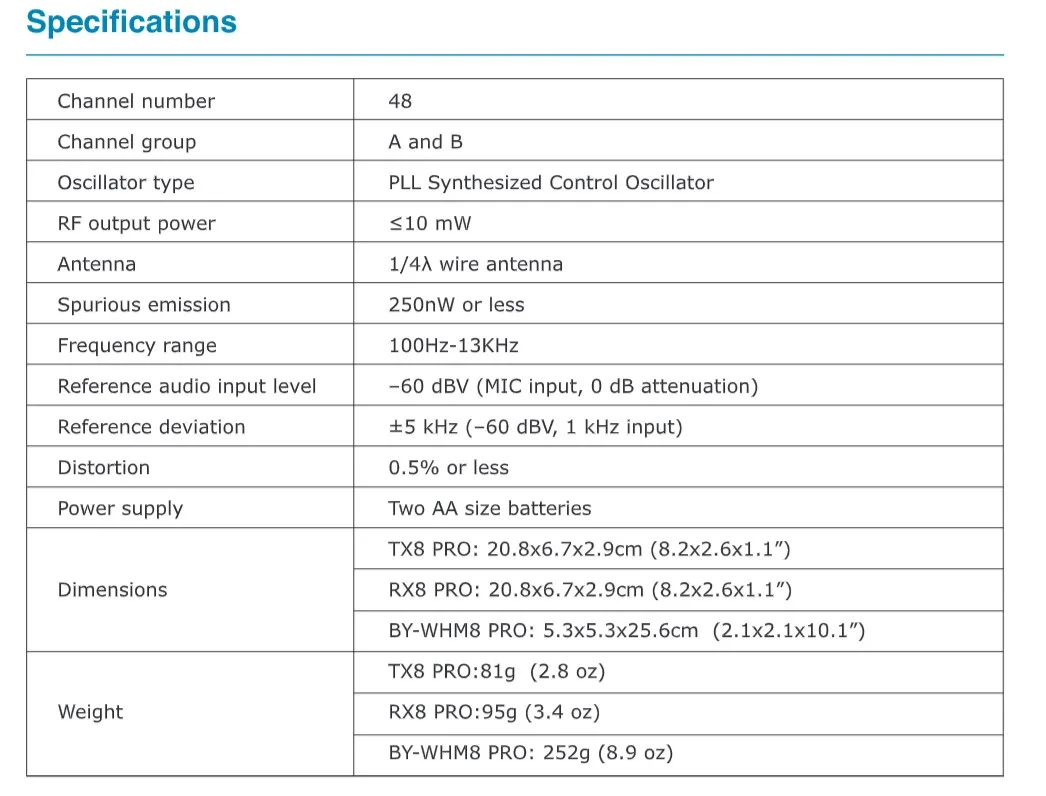 Тип осциллятора: PLL синтезированный осциллятор управленияДиапазон несущей частоты: 576,4 МГц-599,9 МГц (передатчик: A)568,6 МГц-592,1 МГц (передатчик: B)Каналы: 48Частотная характеристика: от 40 Гц до 18 кГц (+/-3 дБ)Рабочий диапазон: 100 м (300 ')(без препятствий)Рабочая температура: 14 ° F до 122 ° F (от-10 ℃ до + 50 ℃)Температура хранения: 14 ° F до 131 ° F (от-10 ℃ до + 55 ℃)