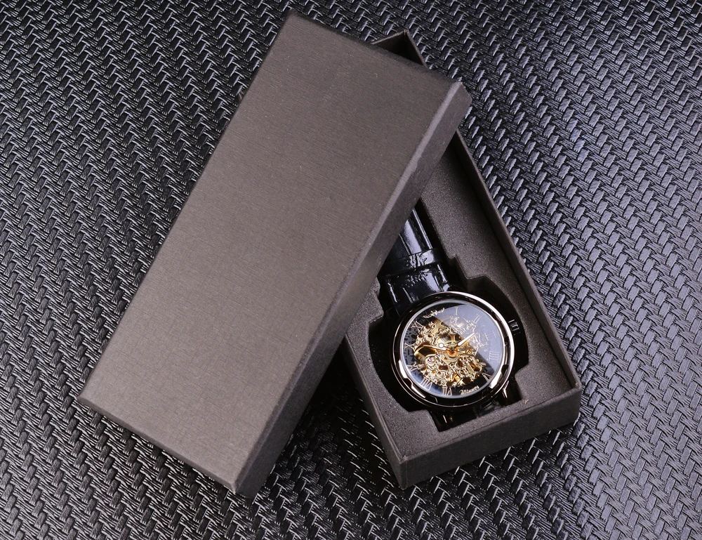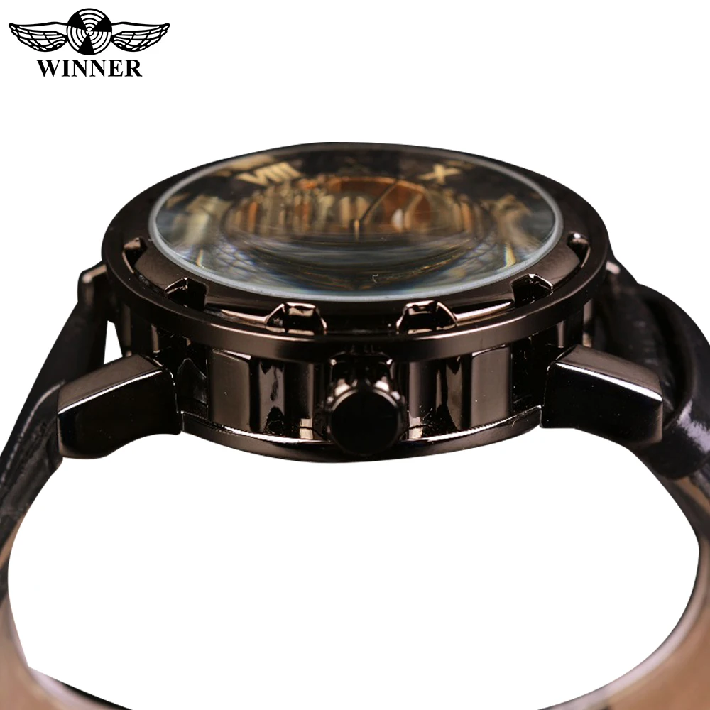 Черное Золото Ретро Мужские часы Скелетон Мужские Часы Роскошный Бренд Кожанный Ремешок Ручные Механические Мужские Часы