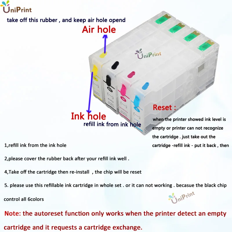 2.Не требует чипа resetter. Он с чипами автоматического сброса, он будет автоматически восстановлен, когда уровень чернил показывает пустой (просто откройте крышку принтера, выньте его, затем повторно установите его снова).3.Пустые многоразовые чернильные картриджи, могут быть заполнены 100 мл всех типов чернил, красителей, пигментов, Сублимация, Съедобные, растворяющие чернила и т. Д. 4.Более удобно, чем СНПЧ (Система непрерывной подачи чернил) с использованием, с трубами или трубами, таким образом, не нужно беспокоиться о ловушке пузырьков и давления чернил.