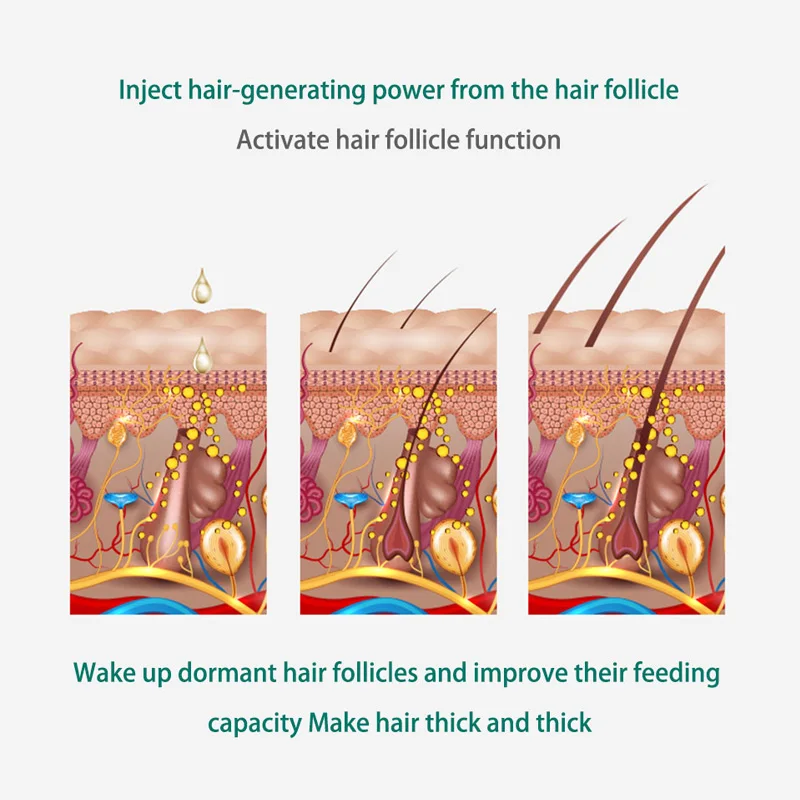 1. Используйте руки или расческу, чтобы раздвинуть волосы, чтобы обнажить кожу головы 2. Поместите насадку близко к коже головы и нанесите на кожу головы для впитывания, принимайте по 5-10 мл дважды в день (конкретный размер зоны использования см.), не нужно мыть 3. Вы можете массировать кожу головы в течение 2-5 минут, чтобы кожа головы поглотила больше эссенции