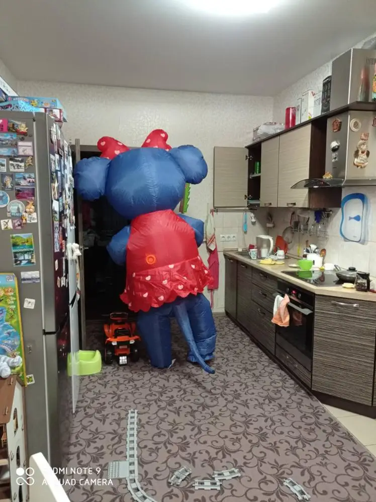 очень прикольный. все работает. в комплекте насос с проводом usb, бокс на 4 АА батарейки с выходом usb, костюм и шляпа. насос работает и от повербанка, надувает быстро.