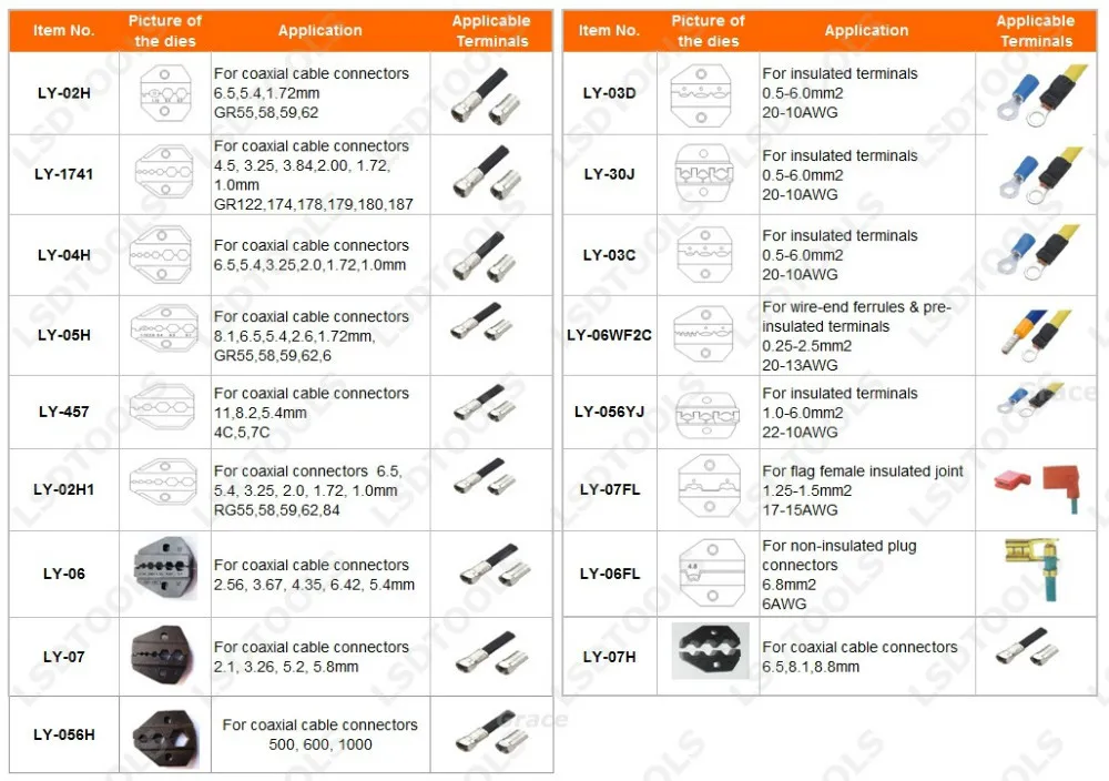 Пожалуйста, посмотрите полный список инструментов для обжима серии LY для различных терминалов и диапазона обжима ниже, вы можете выбрать тот, который вам нравится.