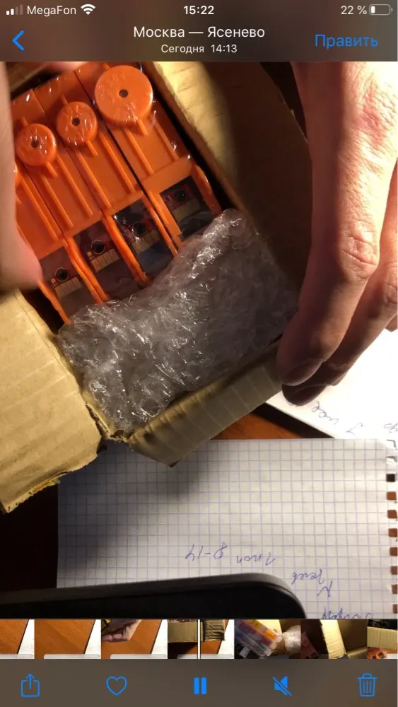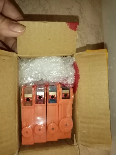 Трек отслуживался. Отправка была не сразу. Шло долго, наверно из-за карантина. Очень компактно все упаковано. Много скотча и внутри пупырка. Картриджи с чипами и были заправлены. На удивление ничего не помялось и не протекло. Сразу поставил желтый и красный. Заглушка имеет свою конструкцию, полезную в транспортировке, но трудно снимаемую. Снимая заглушку с первого картриджа очень сильно потекла краска. Второй я уже более аккуратно распаковывал. Принтер написал, что картридж не оригинальный и больше не ругался. Все тесты печатает. Я очень доволен.