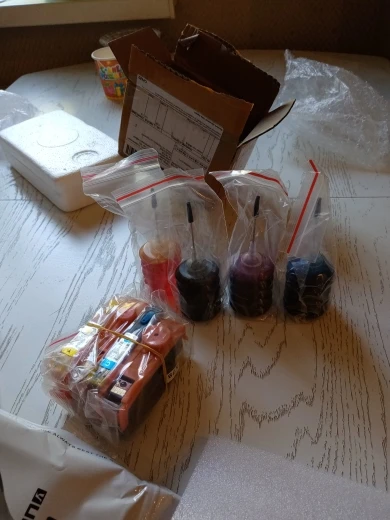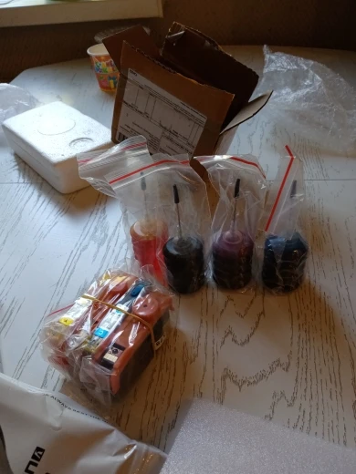 Картриджи шли ну очень долго до Екатеринбурга (заказала в начале декабря, пришли ближе к февралю). Упаковано всё максимально аккуратно, ничего нигде не подтекло за время транспортировки. Поставила на DJ 3070A, пришлось немного повозиться, но это того стоит. Сначала, не подумав, стала распаковывать тут же, в комнате (вам же советую сразу идти к раковине и надеть футболку, которую не жалко), потом были проблемы с одним из картриджей (якобы не читает, повреждён и т. д.). Спасло лёгкое потирание чипа, теперь всё работает. Теперь пытаюсь сделать так, чтобы не было полос при печати (вроде как несколько прочисток головок немного помогло, сейчас хз, что ещё можно сделать). Но картриджи однозначно стоят своих денег, так как сэкономят этих денег ещё очень-очень много (купил чернила за 200-500 руб и залил, а не 5 новых картриджей за 2к).