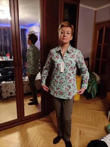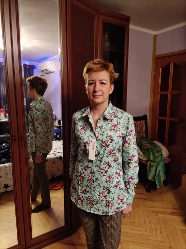 Очень яркая рубашка, на фото цвет немного приглушен. Надеюсь, что после стирки немного выцветет. Ткань очень похожа на х/б, но жестковата без стирки. С продавцом не общалась, не было нужды. Отправили быстро, забрала на почте где-то через 3-3,5 недели в Тольятти. Единственный неприятный момент, что верхняя пуговица немного сломана, но есть запасная, так что не критично. На ОГ 105 брала 4XL, свободненько получилось, но я так люблю.