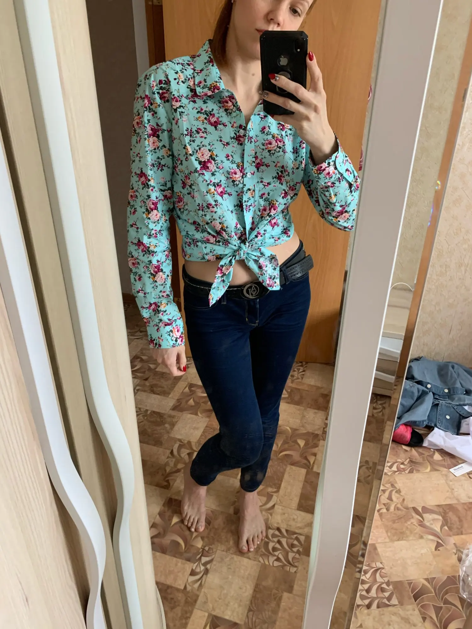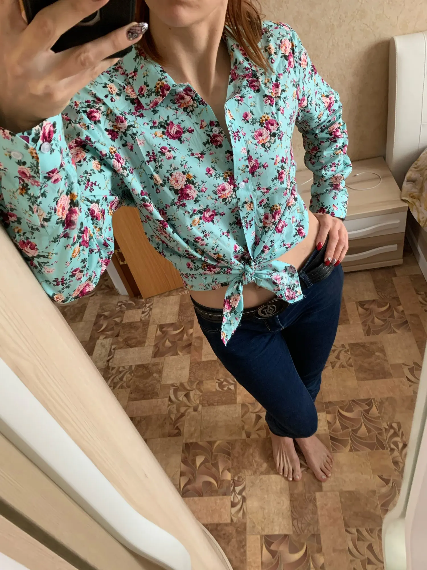 блузка бирюзовая в цветочек просто отличная. хлопок. размер как раз, рукав не короткий. я в восторге.