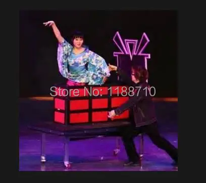 Вот как выглядит для аудитории: небольшая коробка разворачивается, становится достаточно большой, чтобы помощник мог войти в нее. Как только она внутри, коробка снова складывается в маленькую коробку. Похоже, нет места помощнику. Затем, чтобы еще больше доказать отсутствие пространства, три длинных самурайских меча направляются через коробку со всех сторон. Вышеуказанная фотография показывает этот момент в производительности. Иллюзия может быть полностью вращена, показывая все стороны. Помощник просто не может спрятаться. Затем мечи снимаются и коробка разворачивается, открывая помощник.