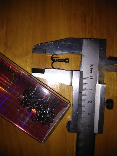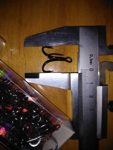 Крючки получил. Заказывал 2 комплекта. Количество почти правильное 29 вместо 30, и в качестве компенсации, 5 застёжек для приманок в подарок. . Пришли быстро, общей посылкой с несколькими похожими заказами. Заказал самый меньший размер - 14. Если мерить в мм., то размер этих крючков - 4.6-4.7 мм. Пытался найти на Али мелкие тройники под изготовление чёртиков. Эти толстоваты, поэтому пойдут на мини-воблеры, блёсенки и балансиры. Толщина проволоки не менее 0.6 мм. Качество изготовления высокое. Правда, острота до японских крючков не дотягивает.