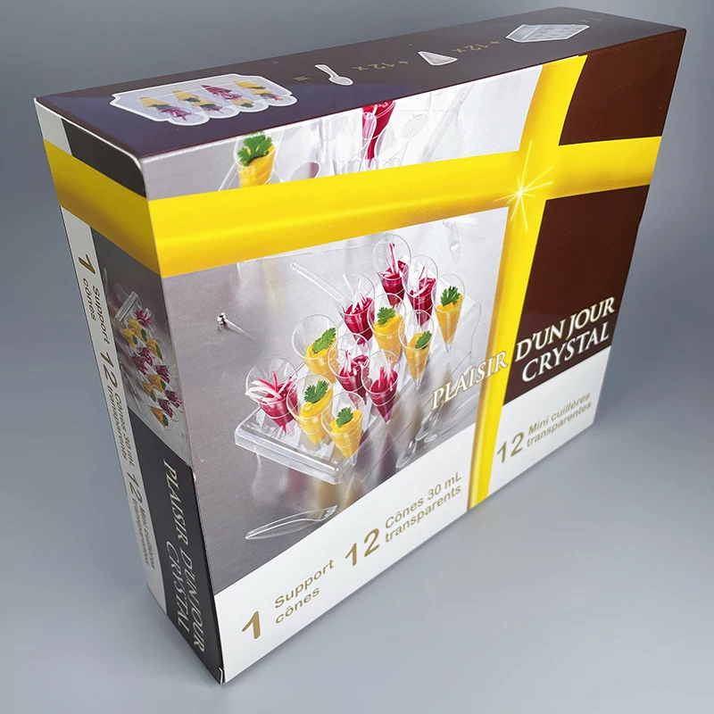 Мини-конусный дисплей (24 см * 20 см); Прозрачный, пластиковый, 1 дисплей + 12 мини-конусов ( 10*6 см), 12 мини-ложка.