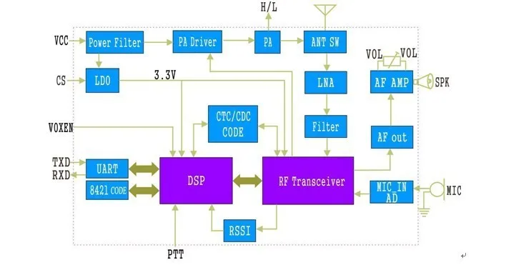 Поворотный переключатель для выбора канала, EEPROM, аудио усилитель, RF усилитель, ключ PTT, гнездо антенны включены в такой маленький размер модуля. Кроме того, все параметры (CTCSS, CDCSS, SQ, предварительно определенные каналы и т. Д.) могут быть легко изменены либо по ПК, либо командой с использованием интерфейса UART. Со встроенным токарным контуром звука пользователь может припаять переменный резистор на Pin16, Pin17, чтобы регулировать громкость бесступенчато.