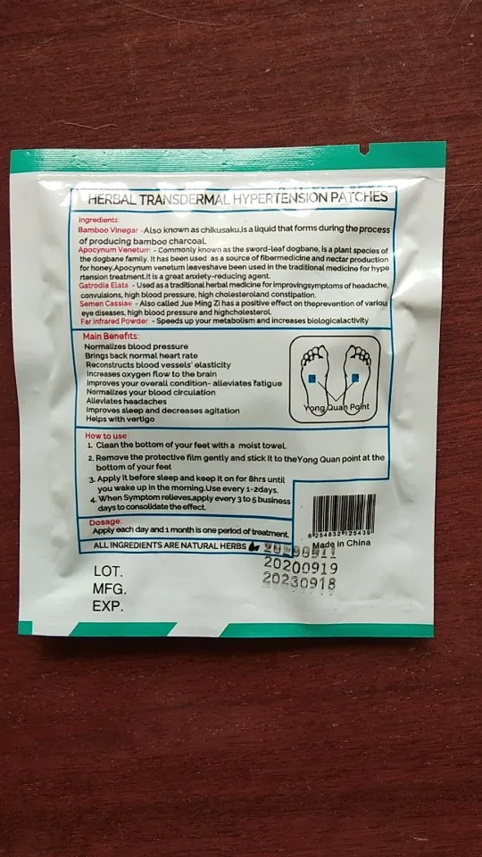Пластырь содержит специальные травяные сапонин, очищенные от концентрации трав и функции, которые эффективно регулируют выход сердца. Он может расширить кровеносные сосуды, уменьшить сопротивление снаружи, чтобы замедлить сердцебиение до нормальной частоты. Уменьшая внешнее сопротивление в начальный период и уменьшая сердечный выход позже, это может уменьшить высокое кровяное давление и успокоить дух одновременно.