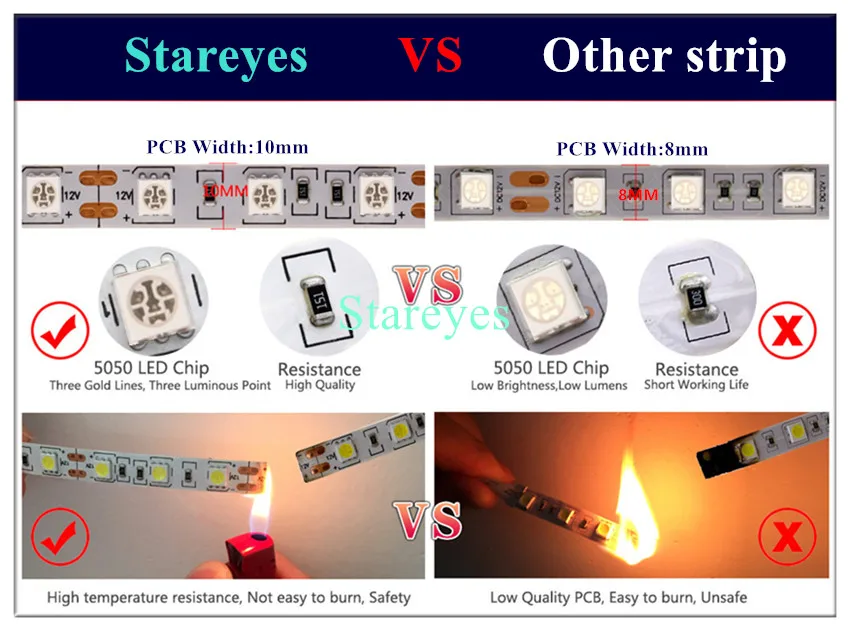Мы не сравниваем цены с другими, мы сравниваем только качество. По соображениям безопасности, пожалуйста, не покупайте дешевую светодиодную ленту, потому что они не были сертифицированыCE RoHS FCC. Наша лента 5050 прошла сертификацию CE RoHS FCC. Пожалуйста, ознакомьтесь с фотографиями.