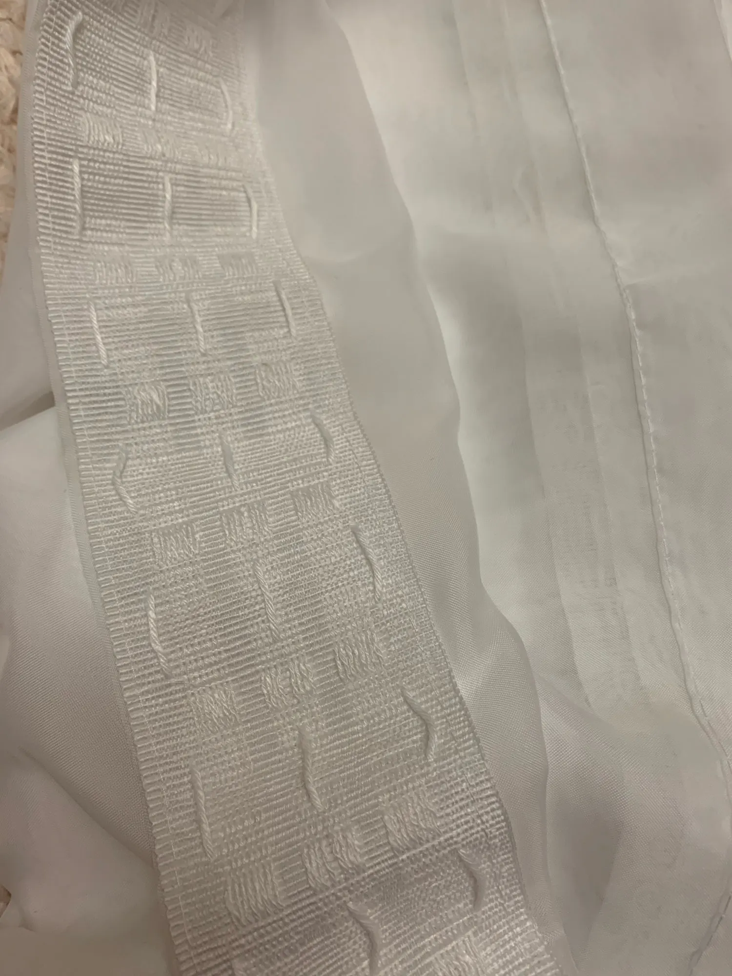 Белая вуаль, отличные шторы, аккуратно сшиты, не ожидала, по моим размерам. Стягивающая лента хлопок, мягкая и это хорошо. Спасибо! Можно заказывать!