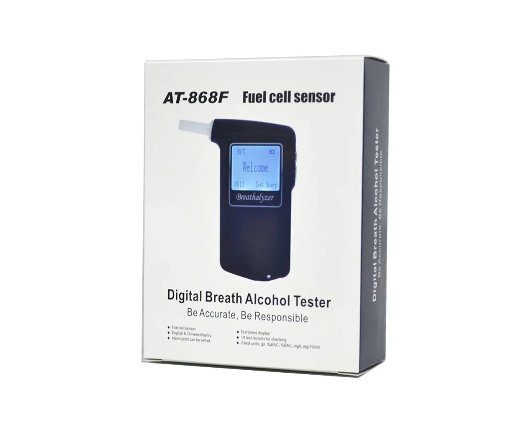 Краткое описаниеСпасибо за использование AT-868F. Пожалуйста, внимательно прочитайте это руководство перед использованием этого устройства и выполните соответствующие действия, чтобы вы могли воспользоваться нашим послепродажным обслуживанием и избежать повреждения устройства или аварии, вызванной неправильной эксплуатацией.Пожалуйста, сохраните правильную инструкцию по эксплуатации, чтобы вы могли проверить ее и получить помощь вовремя, когда вам нужно.Любая ответственность за несчастные случаи, вызванные установкой, ремонтом или заменой компонентов, без использования инструкции по эксплуатации, пользователь должен нести за это ответственность.Внешний вид продукта, цвет принимает материальный предмет как, изображение только поставляет справки.Предостережение1. Для того, чтобы убедиться в фактическом результате теста, отвечающем на концентрацию алкоголя в крови, пожалуйста, получите тестирование через 15 минут при питье.2. Пожалуйста, не выдувайте курить непосредственно на тестер, в противном случае датчик будет поврежден.3. Избегайте использования тестера, когда температура окружающей среды превышает указанный диапазон.4. Избегайте любых высоких трещин или напряженных вибраций.Руководство пользователяПо любым вопросам или без удовлетворения, таким как технические технологии, качество, рассрочка или техническое обслуживание, обслуживание, стандарт зарядки, пожалуйста, свяжитесь с нами, и мы будем иметь дело соответствующим образом.Введение продуктаAT-868F является передовым портативным дыхательным спиртовым тестером. Его основной компонент принимает новый высокотехнологичный датчик топливных элементов с полным независимым модулем, который может точно измерять концентрацию дыхательного спирта, с высокой точностью, высокой чувствительностью, высокая устойчивость и сильная защита от помех. Восхитительный интерфейс человеческого устройства делает работу более выразительной и удобной, белый цветной ЖК-дисплей делает интерфейс более четким и красивым.Основные функции и будущее:1. С высокой точностью, высокой чувствительностью датчик топливных элементов, который обеспечивает стабильную производительность и тестирование точно.2.2.0 'решетка черно-белый ЖК-дисплей, широкий диапазон рабочих температур3. Храните 10 тестовых записей4. Отображение времени тестирования5. Две точки сигнализации для опции: питье, пьянство6,5 тестовых единиц (% BAC, ‰BA C, мг/л)7. Низкий уровень заряда батареи и автоматическое отключение питанияАксессуарыПеред использованием проверьте все аксессуары в упаковочной коробке.1. Тестер алкоголя2. Мундштук (10 шт.)3. Руководство пользователя4. Сумка