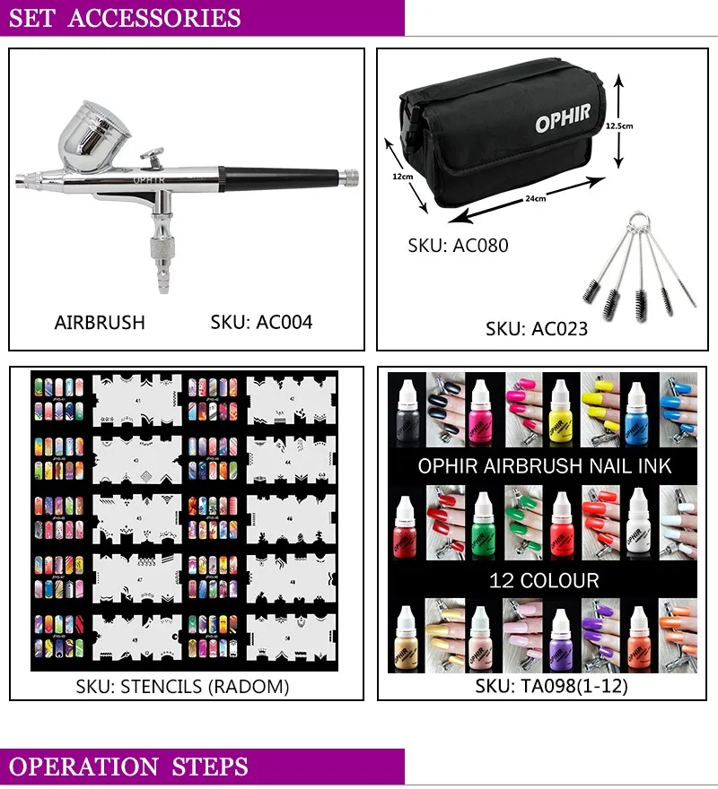 Комплект аэрографа OPHIR 0,3 мм для ногтей, 12x краски для ногтей, розовый воздушный компрессор с аэрографом, трафареты для ногтей, мешок, щетка для очистки, для ногтей, для удаления краски, для ногтей
