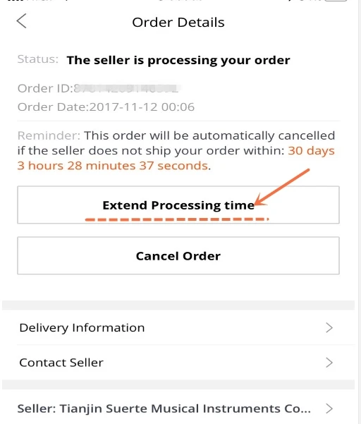 Время обработки (время подготовки) для каждого заказа-это лимиты только для продавцов. Продавцы должны отправить товар до истечения срока, в противном случае заказ будет закрыт автоматически.Если вы согласны со временем подготовки, пожалуйста, помогите нам продлить время обработки после того, как заказ пройдет проверку безопасности на основе следующей инструкции.