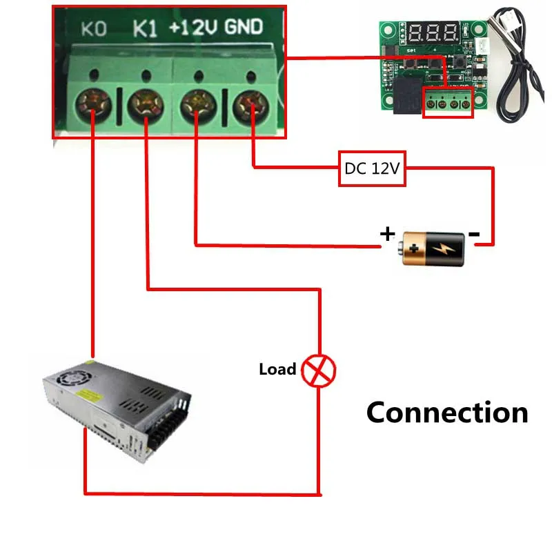 Подключите блок питания и нагрузку, вы можете поставить к контроллеру, отображается как измеренная температура, нажмите кнопку SET, дисплей мигает температурой, нажмите +-для установки нужной температуры, после установки нажмите set для подтверждения возврата, контроллер автоматически выполняет реле, отключив!