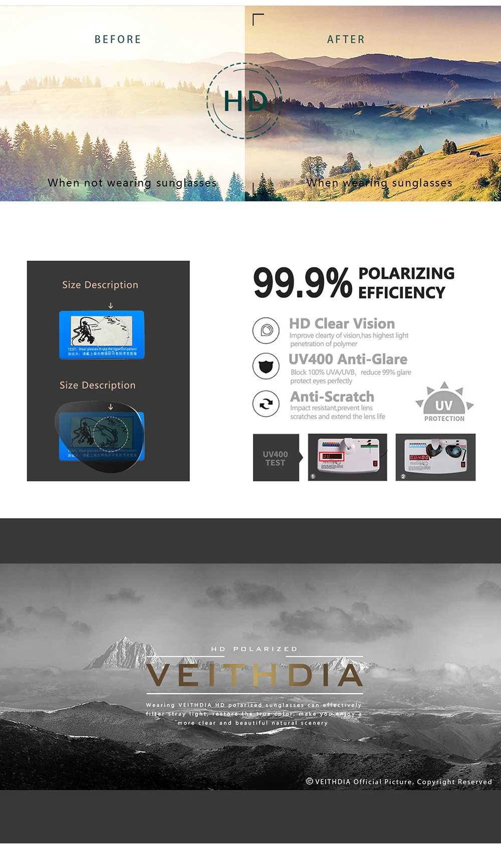 Because of the beauty of their design, good manufacturing and affordable price [I think famous brand sunglasses ask for more money than the real value they provide], I would give a five star review. But, for the reason of their simplicity and Iow-end case, a more appropriate rate could be one of four stars. Nevertheless, to be fair, for such a price, maybe I do not deserve nothing better. So that, perhaps, a more fair rate would be one of a four and a half star. Delivery has been fast. Veithdia, thank you for your sunglasses. Keep improving the quality of your products.