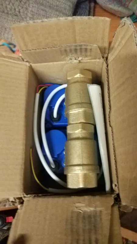 Сам кран с очень толстой стенкой, давно такую не видел. Открывается и закрывается секунд за 5 примерно. Два провода и общий минус. Замыкаешь одну группу и он открывается. В кране стоят концевики, отключается от питания сам. То же самое на закрытие. Выглядит очень качественно.