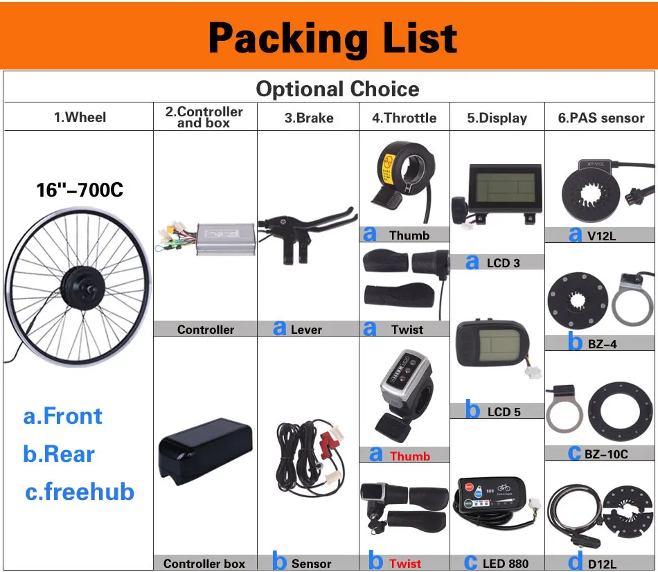 Этот комплект поставляется со всем необходимым для преобразования вашего велосипеда в электровелосипед, кроме аккумулятора и зарядного устройства. Вот Упаковочный лист: