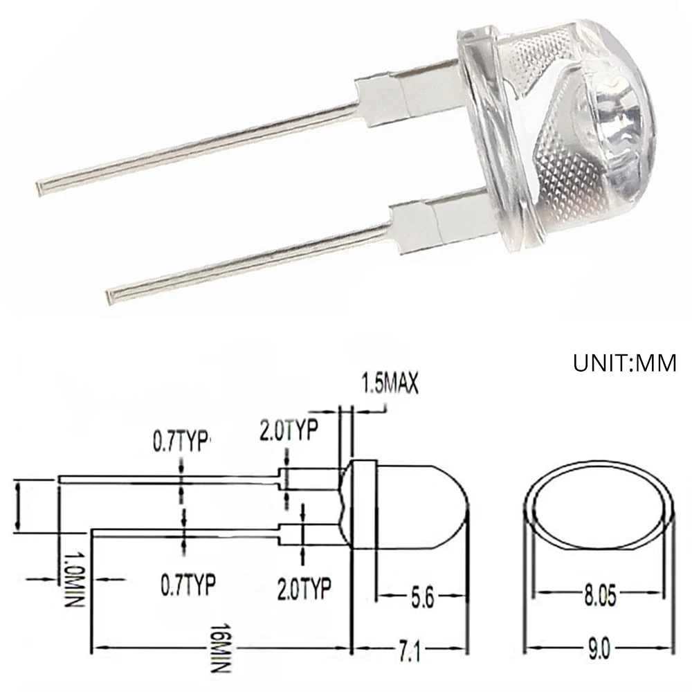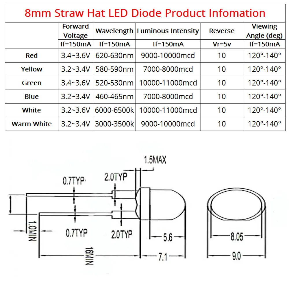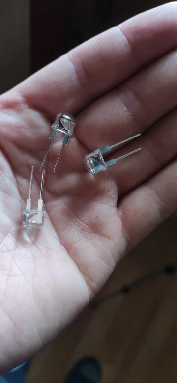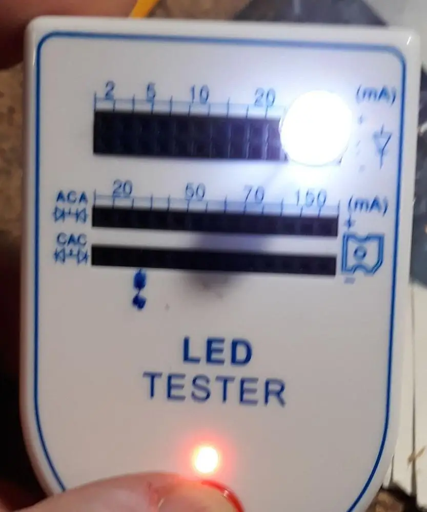 Товар прибыл в течение 1 месяца. Красный тусклый, 5 мм нормальный светодиод имеет более сильный свет. Не 1000 люменов-это разница по сравнению с белым, гораздо больше. Управляемый 20 мА не очень яркий, я не пробовал 150 мА. Слева находится обычный светодиод 20 мА 5 мм, справа-светодиод 30 мА.