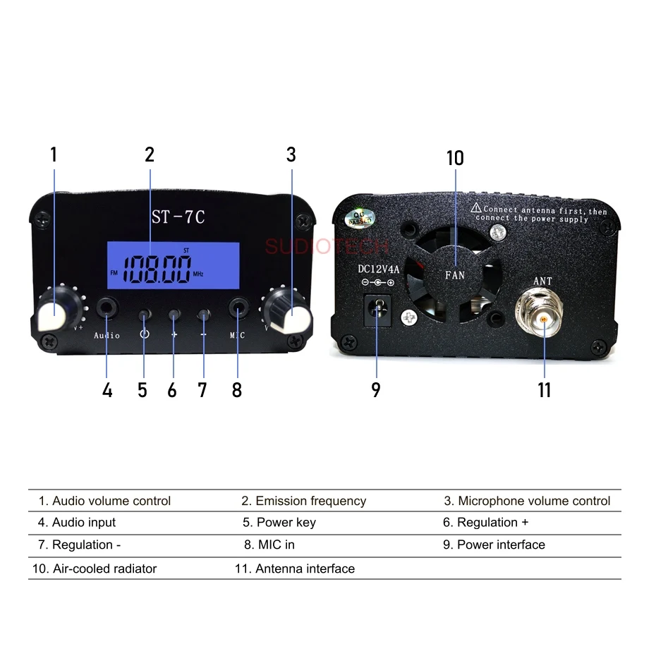 * Сначала Подключите антенну, затем подключите источник питания, в противном случае передатчик будет сожжен.