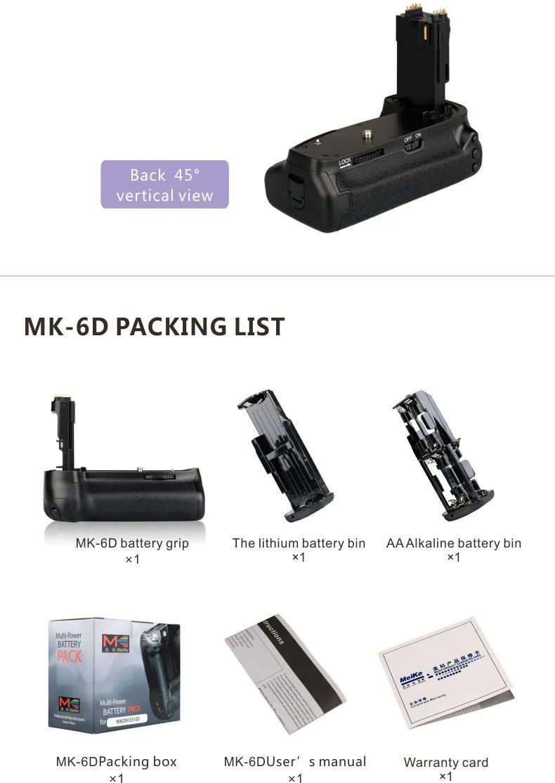 Толщина MK-6D оптимизирована для того, чтобы облегчить обработку. MK-6D обладает такими же водонепроницаемыми и пыленепроницаемыми характеристиками, как и Canon 6D, помогает вам свободно снимать на открытом воздухе, улучшая портативность canon 6D