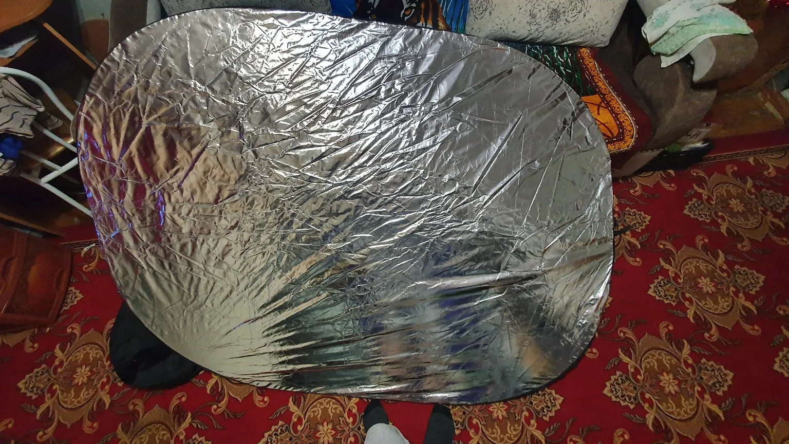 Брал за 4600 с копейками. Немного дороговастенько, но мне нужна была такая штука из-за белой стороны (а отдельно не продавалось, только 5 в 1) Отправили быстро. Товар пришёл в г. Лесосибирск (Сибирь) где-то за 2 недели или меньше. Получил через курьера службы доставки DPD прямо на дом, что малость удивило. Упаковано было более-менее нормально. Своим размерам вроде как соответствует, не измерял, но могу сказать, что по длинной стороне отражатель выше меня, а я сам ростом 186 см :D Белый, чёрный, на просвет, золотой и серебряный экраны, материалы хорошие. Свою работу выполняют. Чехол плотный и прочный, молния хорошая. Свёртывать пришлось вдвоём, изрядно поломав голову как это правильно сделать вдвоём, но если наловчиться, то думаю можно и в одного управиться. Ниже на фотографиях примеры: серебряная сторона, сфотографированная на ширик на телефоне и уже упакованный в чехле отражатель, где Бетмен для наглядности показывает его размер :) Я доволен! Спасибо продавцу! ;-)