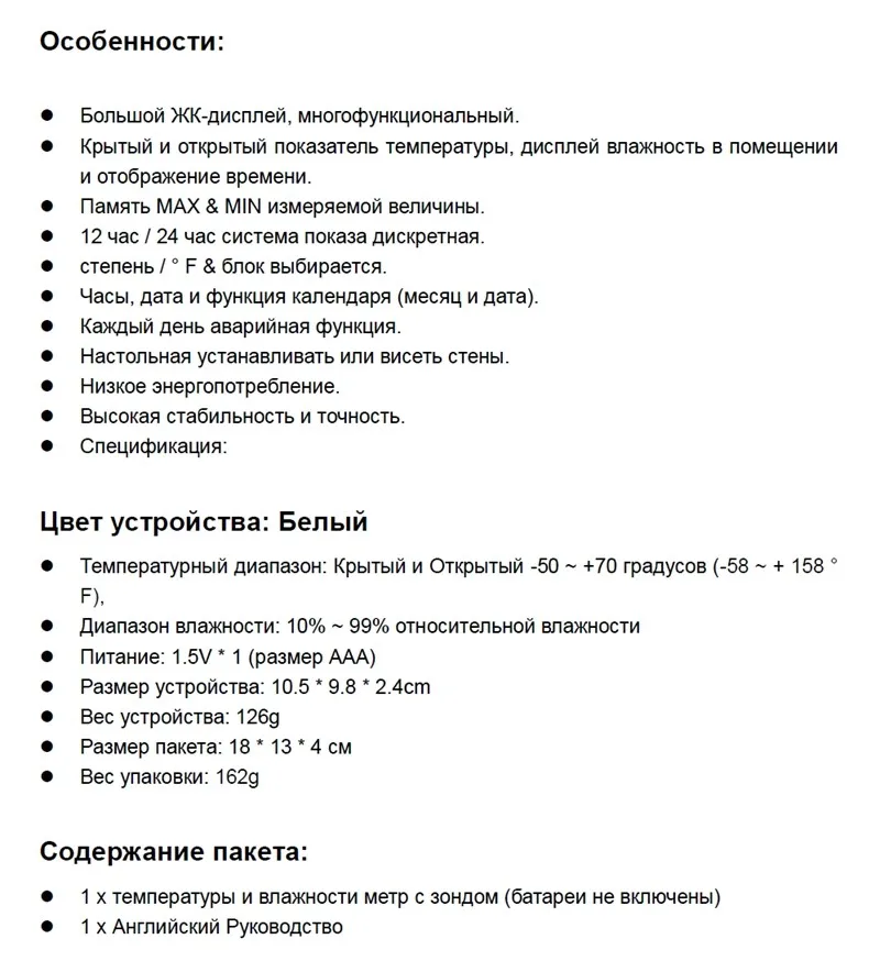 Пришел за 2 недели. Упакован хорошо, почта квитанций не прислала - надо по номеру на сайте почте самому напечатать квитанцию, когда в доставке будет написано, что находится в пункте выдачи (в моем случае почта). Показания датчиков точные (сравнивал с другой, более дорогой метеостанцией, совпадает и температура и влажность). Датчик находится у меня на улице, за пластиковым окном. Описание и фото полностью соответствует полученному прибору.