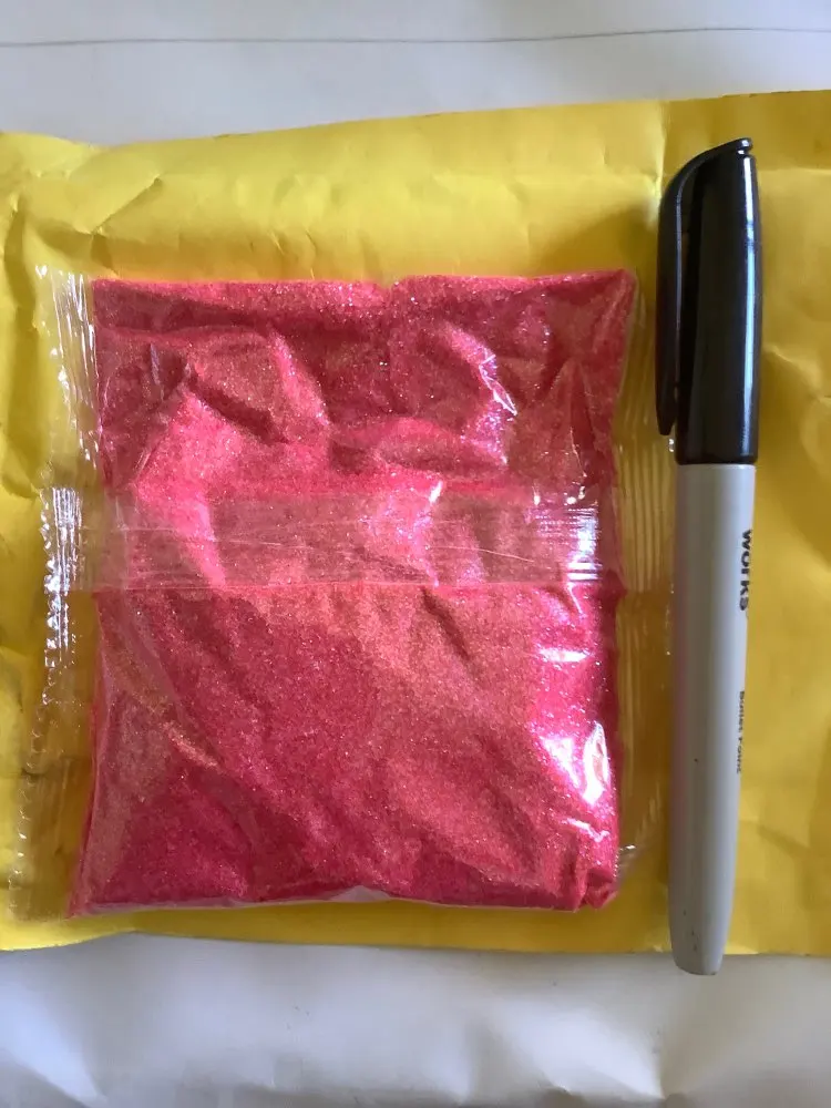 Шло примерно 1,5 месяца. Блёстки очень классные. Чуть больше 100гр в упаковках. (Я заказала несколько цветов). Привезли домой.