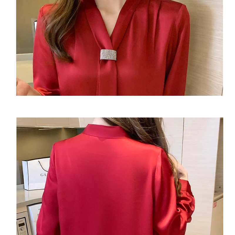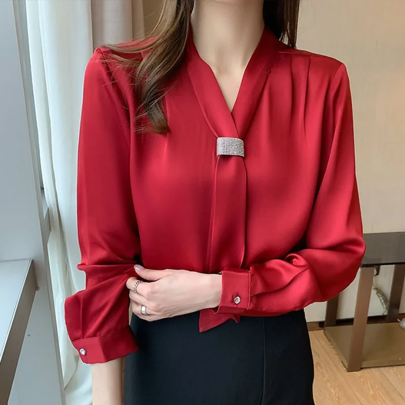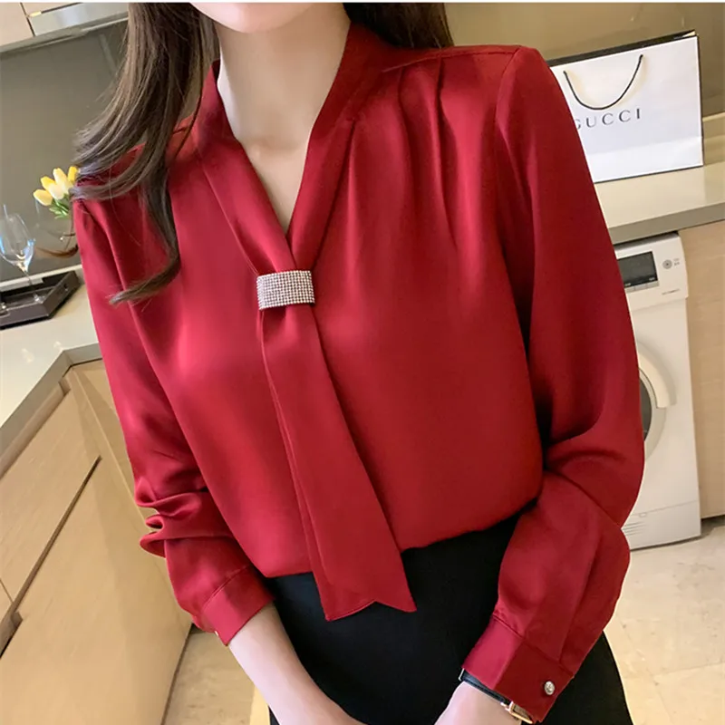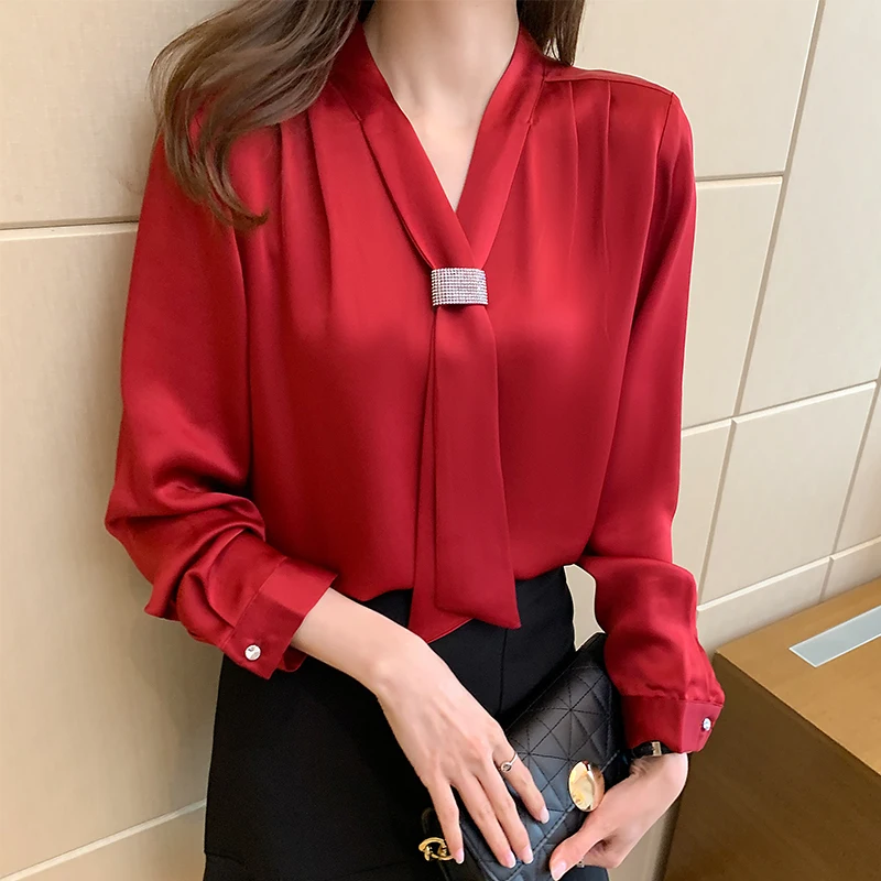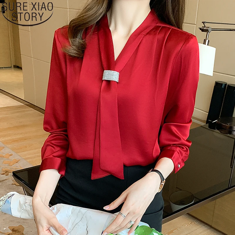 Корейские женские рубашки, атласные блузки для женщин, рубашки с длинным рукавом, топы, женская блузка с лентой, топы, модная женская рубашка с бантом, 18612