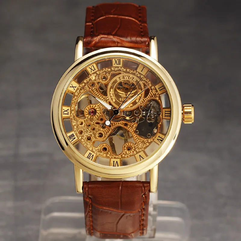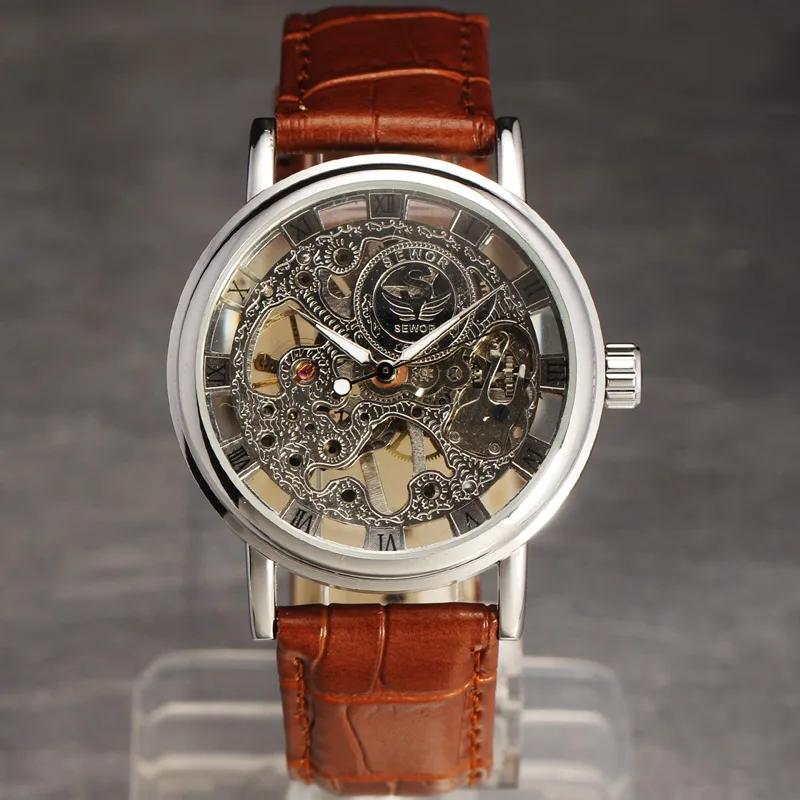 Часы-скелетоны Мужские механические с кожаным ремешком, в стиле ретро