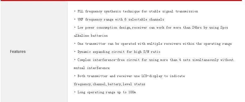 WTG-500 передатчик-1 шт. WTG-500 приемник 1 шт. Наушники 1 шт. Головной микрофон на расстоянии 1 шт. 3,5 мм до 3,5 мм единицы измерения кабель 1 шт. Руководство пользователя 1 шт. Посылка: крафт-бокс