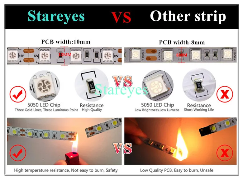 Мы не сравниваем цены с другими, мы сравниваем только качество. Из соображений безопасности, пожалуйста, не покупайте дешевую светодиодный ную ленту, потому что они не были сертифицированы CE RoHS FCC. Наша лента 5050 была сертифицирована CE RoHS FCC. Пожалуйста, посмотрите фотографии.