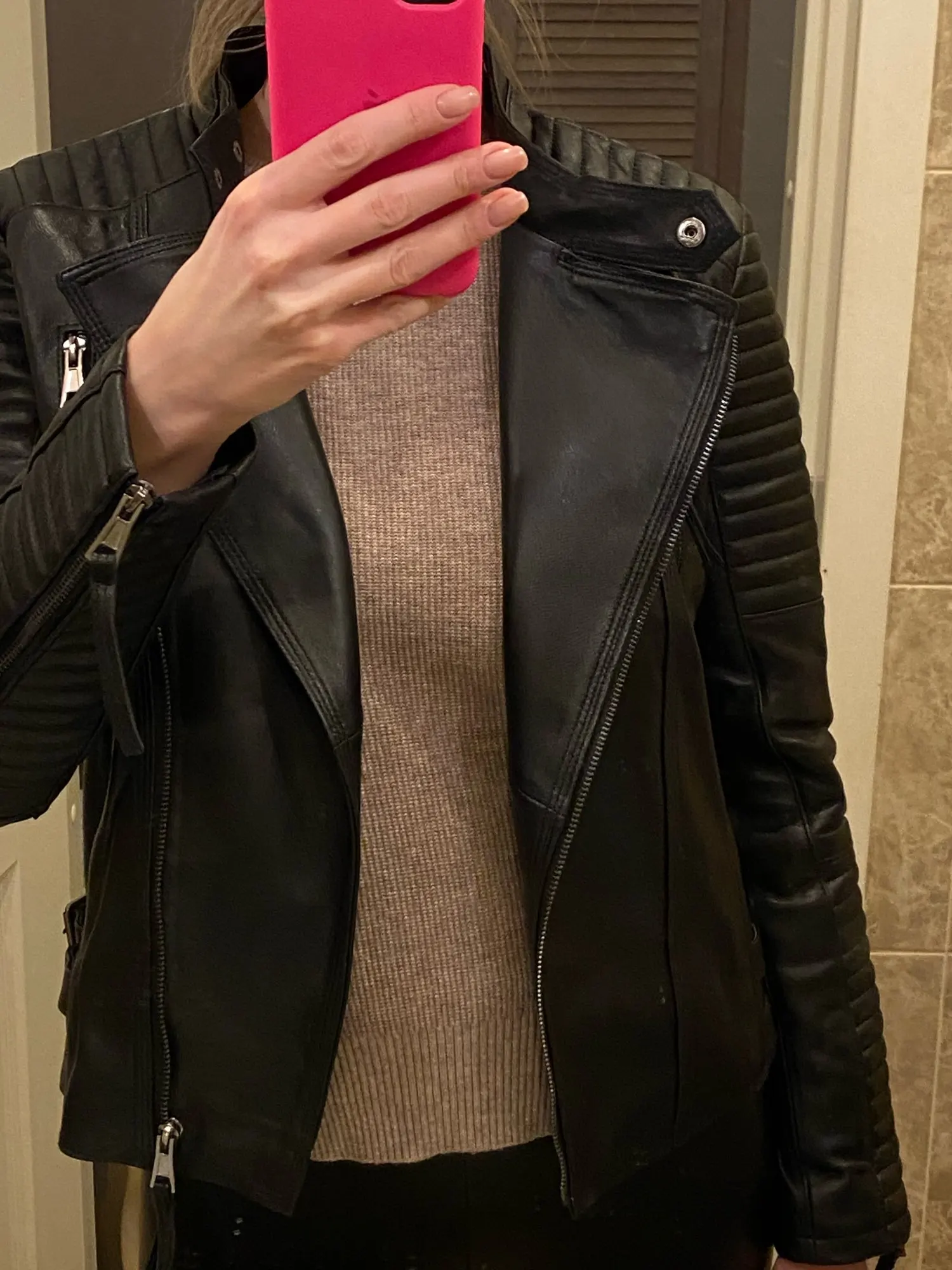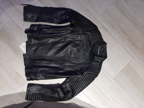 Куртка так себе, на троечку. Запах стойкий и малоприятный. Узкие рукава, не кожа. В остальном в размер попала. Ношу 44. Фурнитура тусклая, не яркое серебро. При моем росте 180, по пояс. Рукав хотелось бы подлиннее, но не критично. В общем иногда можно надеть.