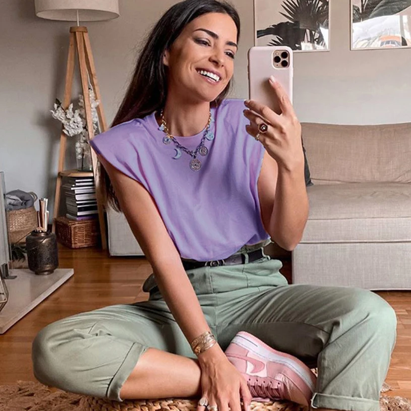 Женская Однотонная футболка без рукавов с круглым вырезом, офисный ...