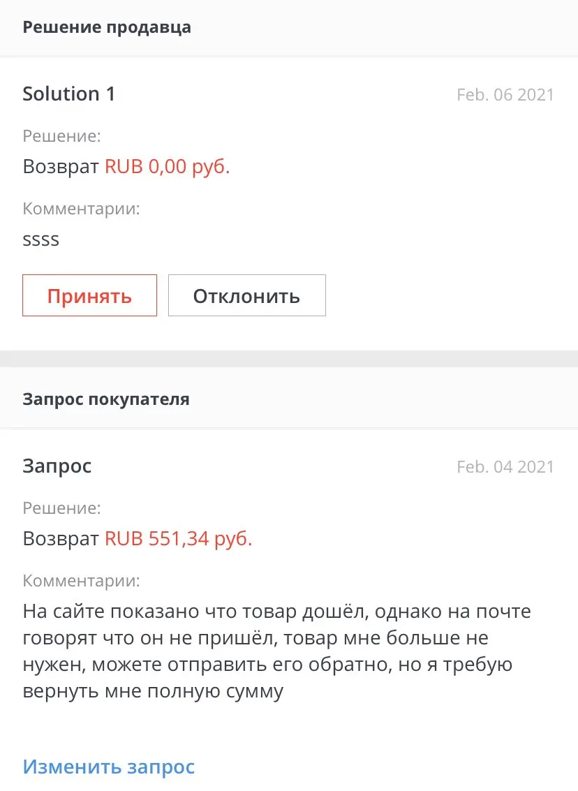 Товар не пришёл но, при всём при этом мне пишут что «заказ доставлен оставьте отзыв». На решении продавца я просто поразилась, отставлять какие то непонятные символы без доказательств и без всего. Я ТРЕБУЮ ВЕРНУТЬ МНЕ ДЕНЬГИ, У МЕНЯ НЕТ НА РУКАХ НЕ ТОВАРА, НИЧЕГО. Что это за отношение к покупателю, просто отвратительно.