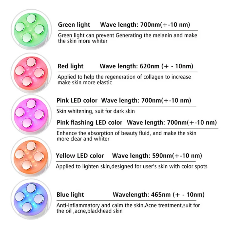 1. Красный светодиодный светильник: Красный светодиодный светильник используется для лечения вмятин, светодиодный, для улучшения регенерации коллагена и кожи; 2. Зеленый светодиодный светильник: Зеленый светодиодный светильник используется для лечения темных пятен или обесцвечивания кожи, чтобы предотвратить перепроизводство меланина. 3. Синий светодиодный светильник: Синий светодиодный светильник используется для лечения акне и жирной кожи. 4. Желтый светодиодный светильник: Желтый светодиодный светильник используется для осветления кожи. Подходит для кожи с темными пятнами и тусклыми участками. 5. Розовый Светодиодный светильник: Розовый Светодиодный светильник используется для отбеливания кожи. 6. Мигающий Розовый Светодиодный светильник: Розовый Светодиодный светильник используется для облегчения проникновения средств по уходу за кожей.