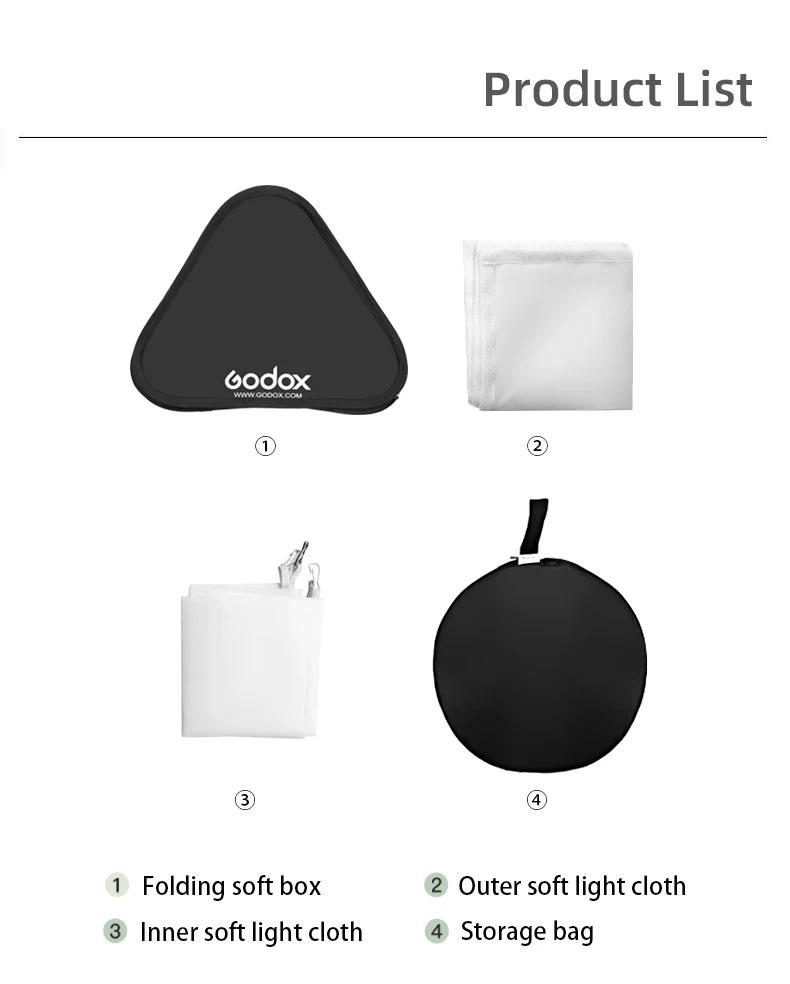 Посылка содержит:Софтбокс Speedlite 1x40 см1 × внутренний диффузор1 × внешний диффузор1 х сумка для переноски