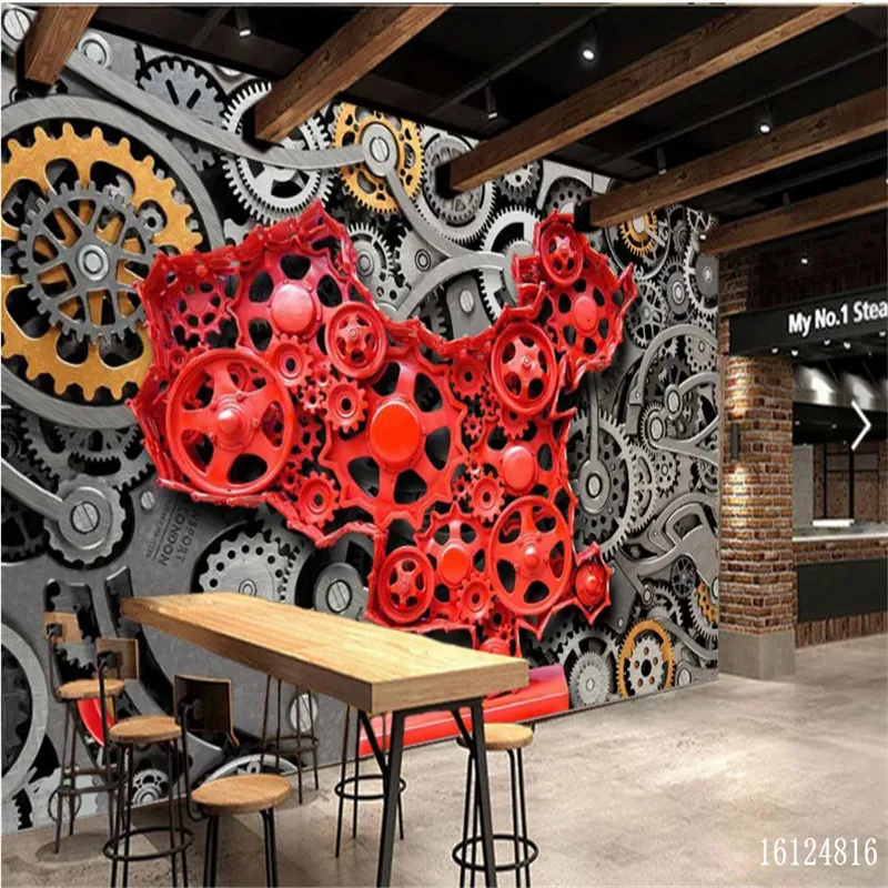 Ретро ностальгические механические шестерни красный Китай карта настенная бумага 3D бар КТВ промышленный ветер Декор настенная бумага Papel де Parede 3D