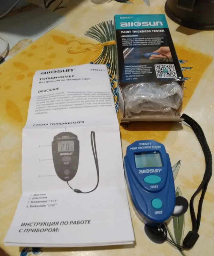 вообще супер! своих денег стоит! сразу видно крашеный элемент, а если шпаклевка, то тем более! если деталь слегка крашеная по верх краски, может прибор и не показать. (не на столько точный) а так все супер. инструкция на русском в комплекте! перед использованием. нужно снять пленку под батарейкой (на фото видно) !