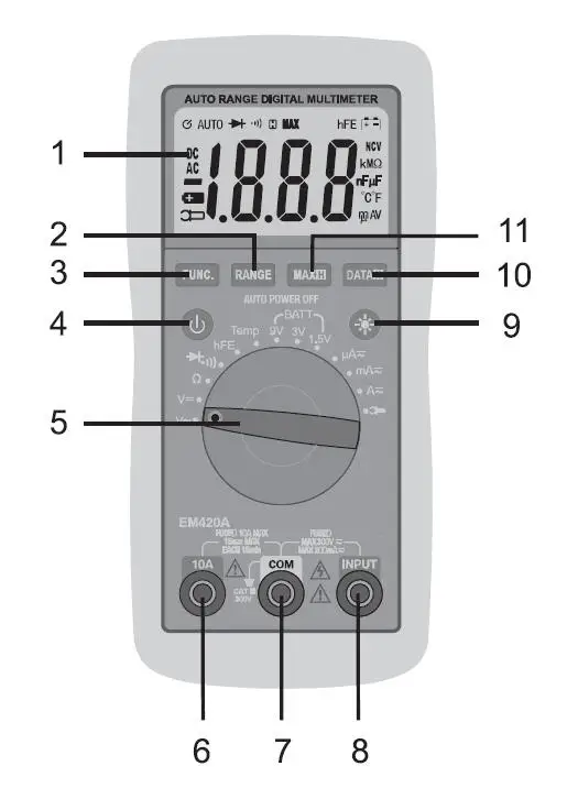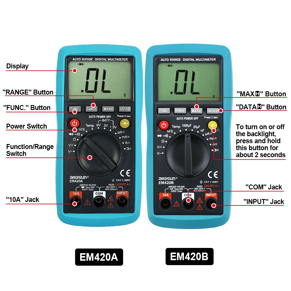 Эта серия мультиметров компактные 3 1/2 цифр Цифровые мультиметры предназначены для измерения постоянного и переменного напряжения, постоянного и переменного тока, сопротивления, диода, транзистора hFE, непрерывности, температуры, батареи (EM420A) И емкость (EM420B ). Они оснащены индикацией полярности, удержанием данных, режимом максимальной записи и т. д. они просты в эксплуатации и являются идеальными инструментами тестирования.